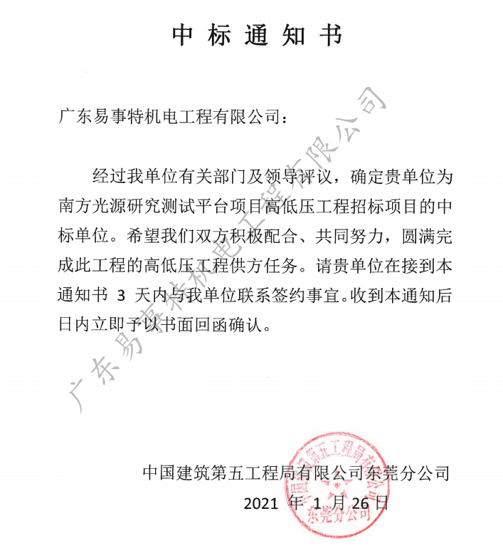 2021年1月26日,我司憑借豐富的施工經驗、雄厚的技術力量和良好的信譽成功中標南方光源研究測試平臺項目高低壓工程